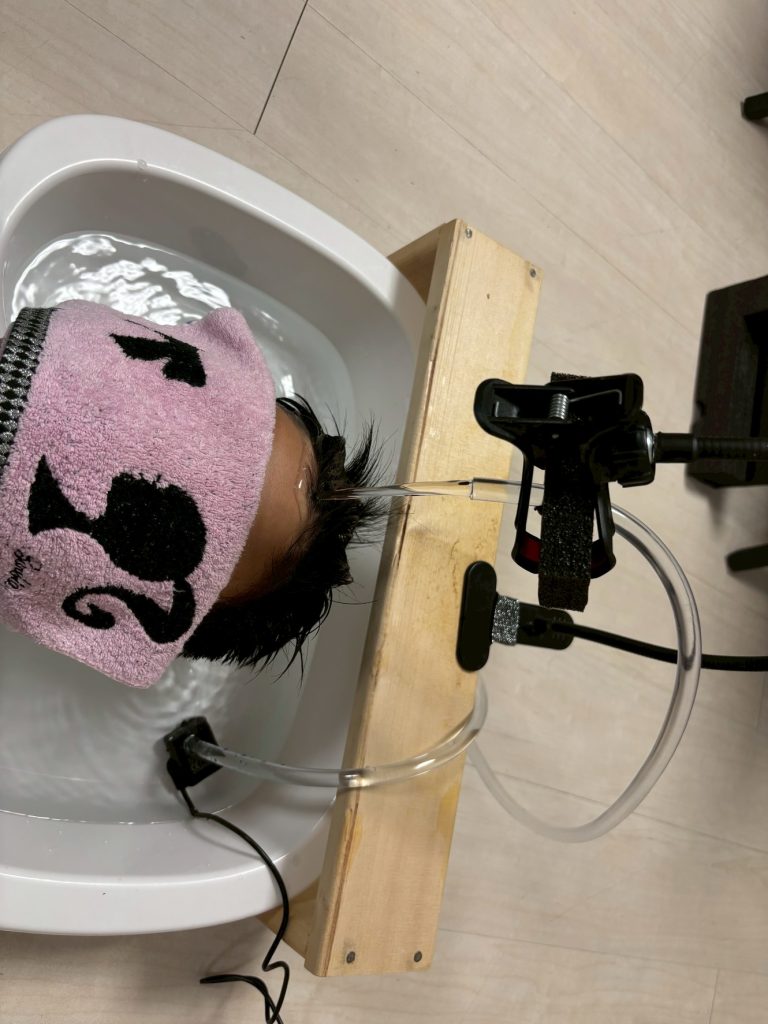 35度のぬるま湯を頭皮にかけます。